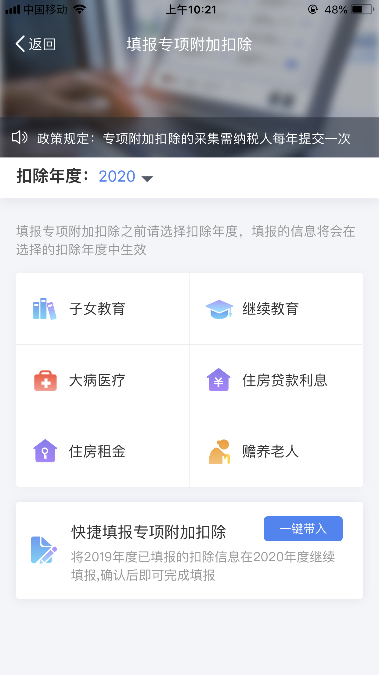 选择扣除年度【2020】,点击“快速填报”中的“一键带入”按钮。