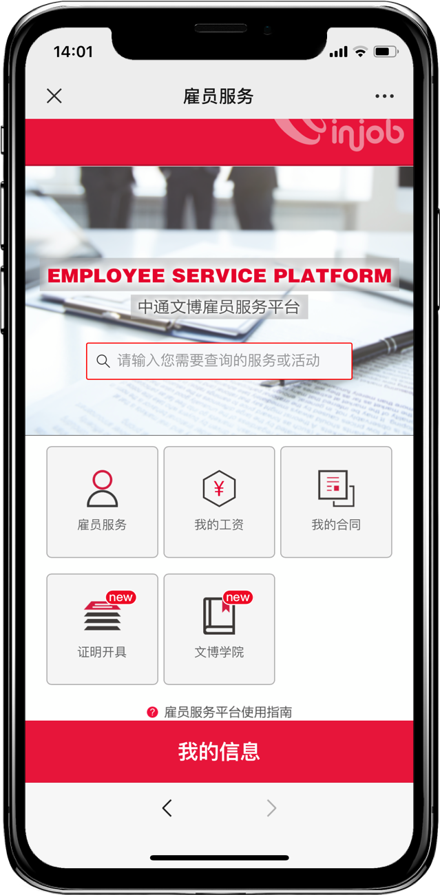 关注公众号“中通文博”,通过公众号菜单栏-【员工服务】-【雇员服务】进入平台;