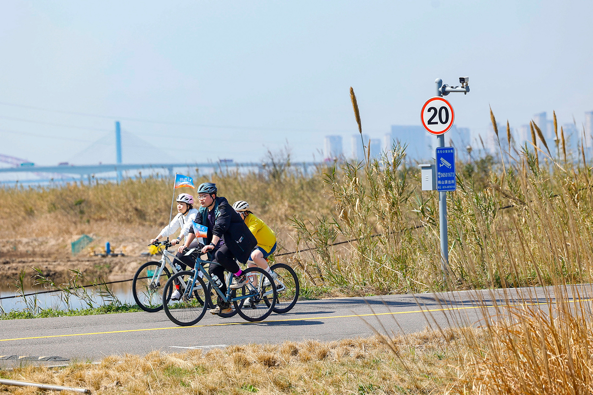 活动以“环湾30公里”为主线,骑行队伍沿梅山湾海岸线蜿蜒穿行,途经红桥、梅东大闸等标志性景观。专业骑行领队毛飞翔带领参与者完成科学热身,并根据体能差异分阶段设置挑战目标。每位骑手车把上均固定着“骑遇春天,蓝湾同行”的定制彩旗,在海风轻拂下形成流动的色彩长廊。沿途特别设置“能量补给站”与“生态打卡点”,提供低糖高纤维食品及海湾生态知识科普,将运动健康与生态保护理念有机结合。
